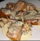 Grilled shrimp over fried polenta in gorgonzola cheese and cream sauce.